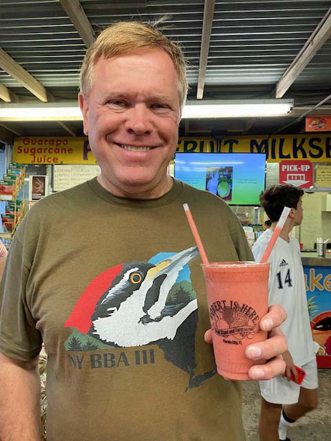 We headed out of the park. I wanted to try some alligator so we stopped at the Gator Grill. This iconic spot cooked us up some tasty and spiced gator bites. We each tried some. It tasted a lot like chicken but the meat was a bit tougher. Next stop was a place call Robert is Here. It is a local fruit stand with lots of weird fruit, animals out back, including an Emu. Robert is Here is also known for their fruit smoothies. We tried the Strawberry Key Lime Smoothie. It was OK. Mark enjoyed his chocolate vanilla milkshake.