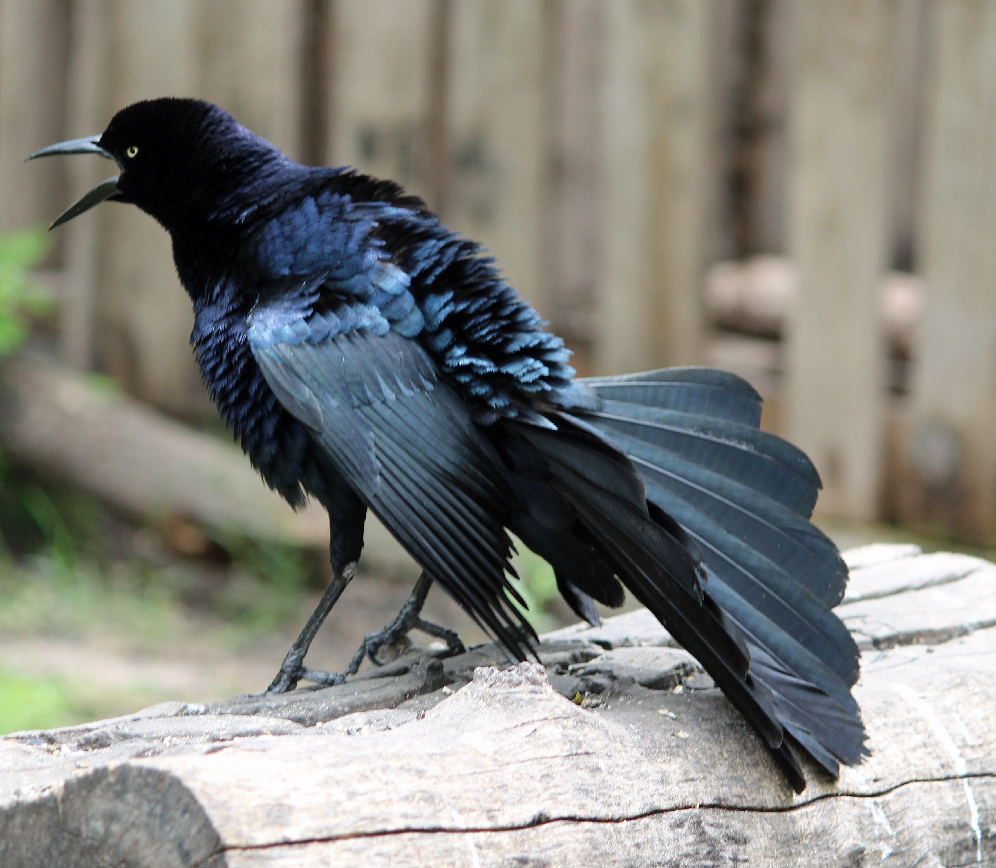 Next, we visited the near-by National Butterfly Center. After looking at the visitor’s center, we drove back to the bird feeders. We heard that a male Audubon’s Oriole had paired with an Altamira Oriole, and both might visit the feeders. We had to wait a little while for them to them fill up for the 1 pm feeding. Then it got busy!Plain Chachalaca and Great-tailed Grackle were busy displaying while feeding.