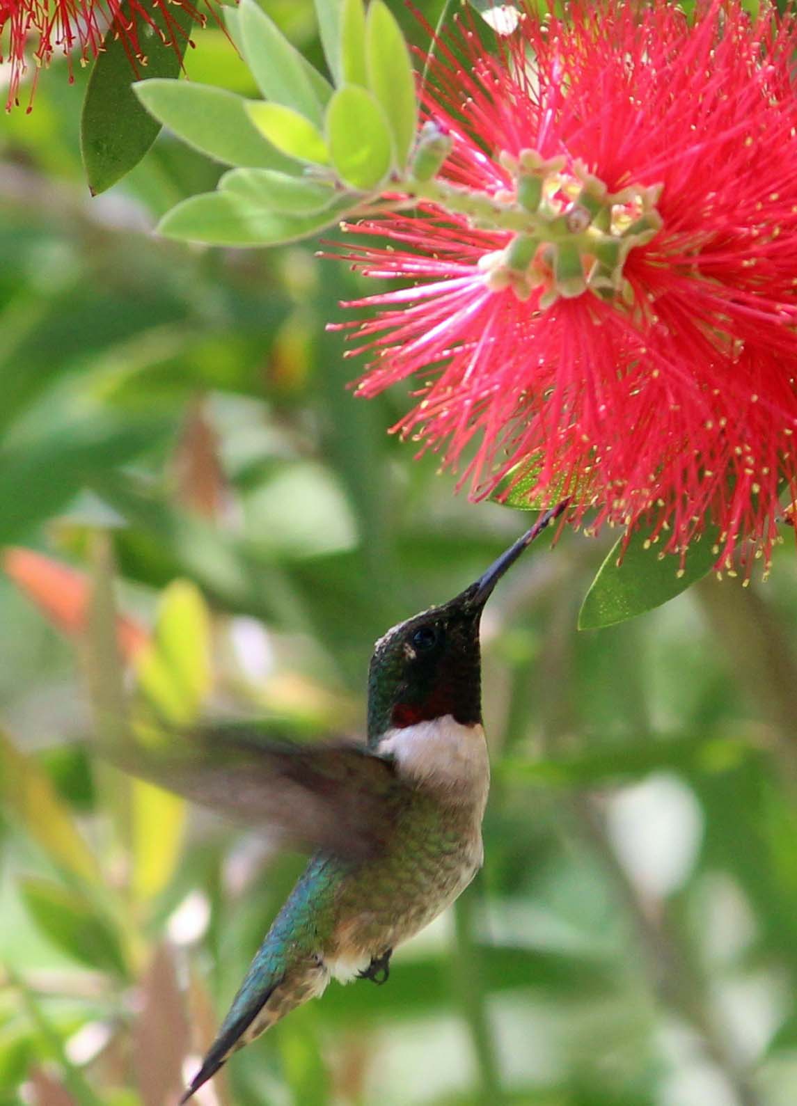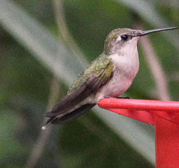 A hummingbird feeder next to the tram stop attracted a female Ruby-throated Hummingbird.